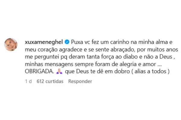 Fãs de Xuxa também se manifestaram: “Quem viveu essa época sabe o quanto os líderes religiosos levavam a gente a crer mais no diabo do que em Deus”, disse Felipe Cayres. “Xu, se eu pudesse, você não teria passado por nenhum daqueles conflitos que você passou na sua carreira, mas sua luz venceu e hoje você colhe tudo”, comentou Daniela Rocha.